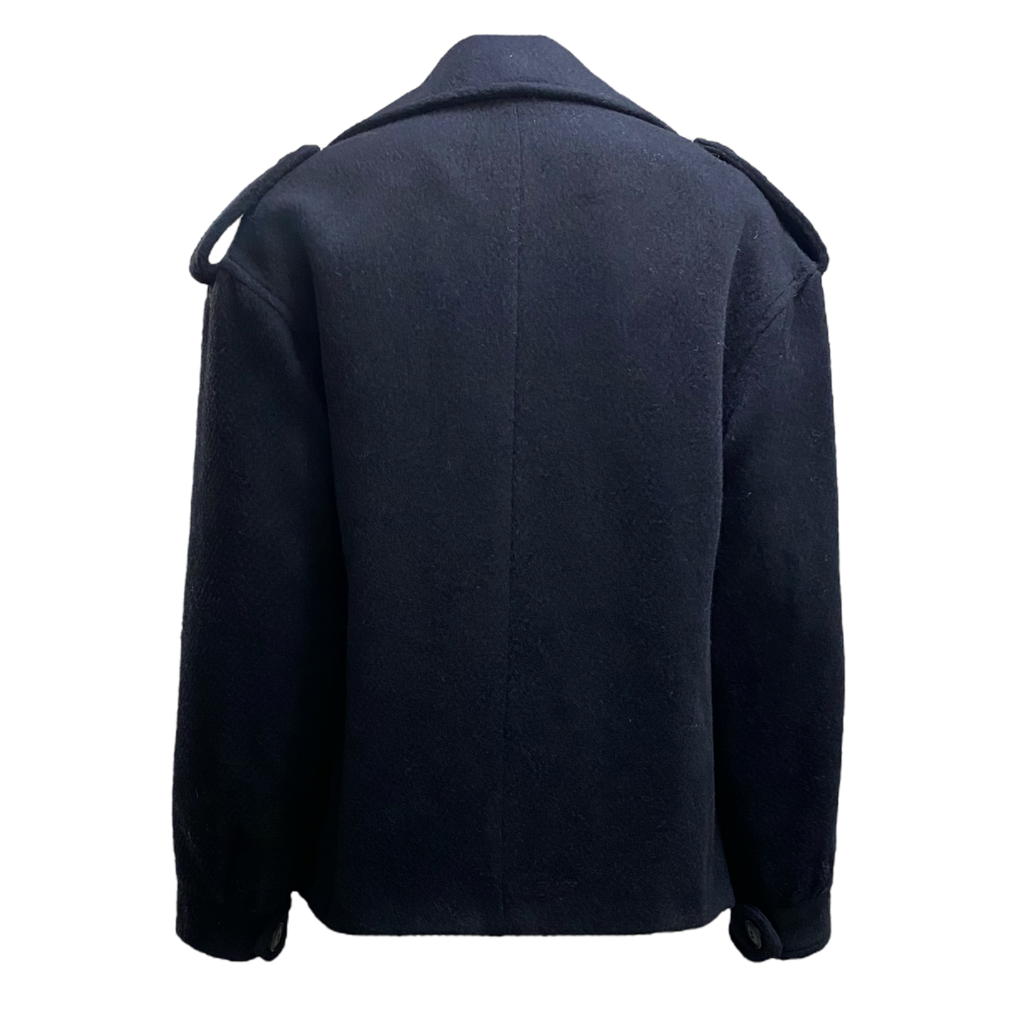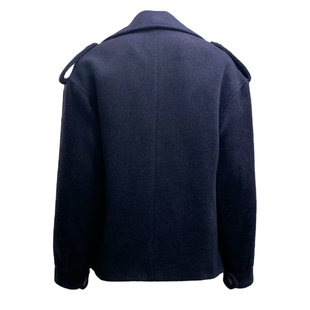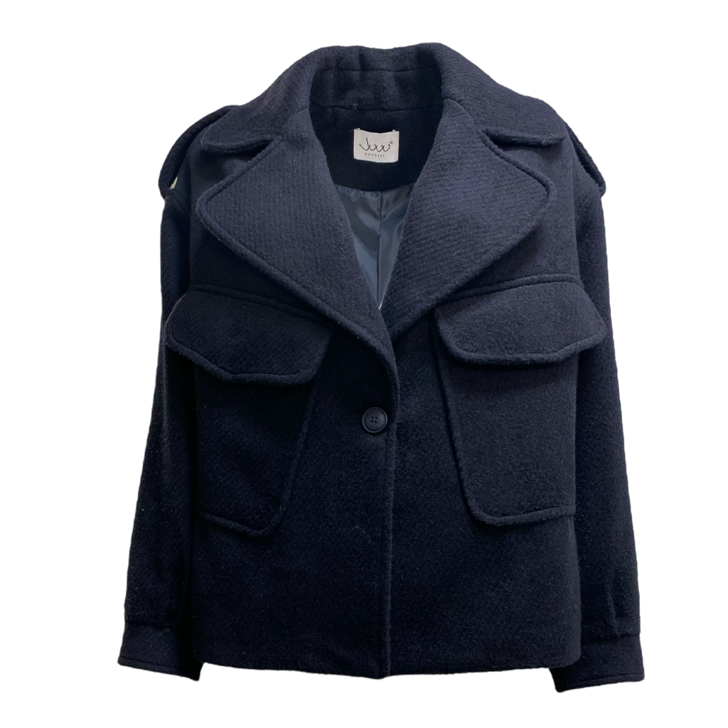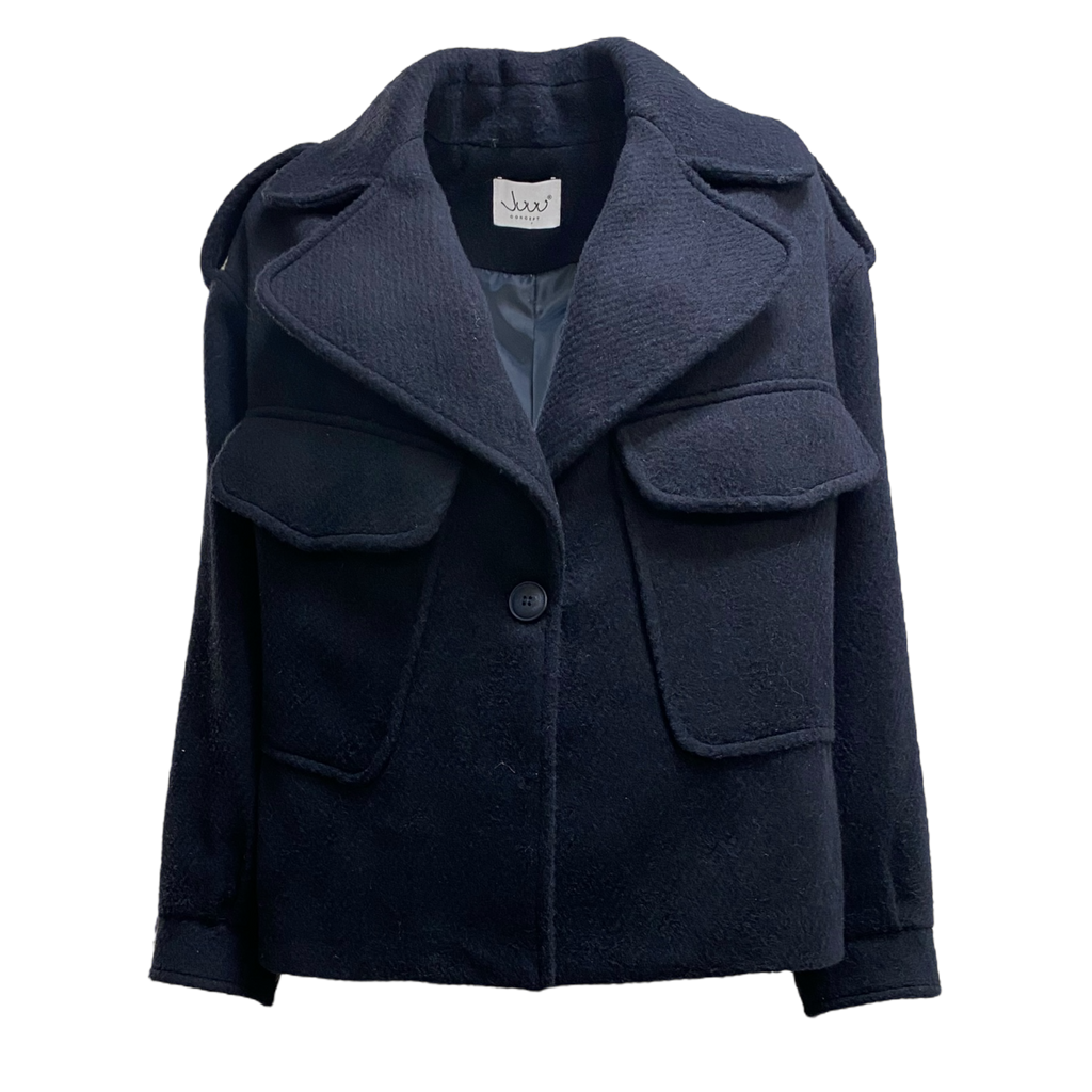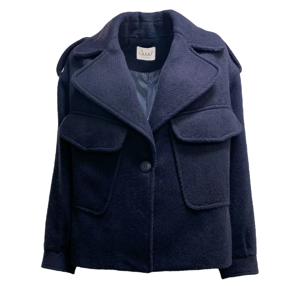 Giacca blu in panno con tasconi, chiusura con un bottone.