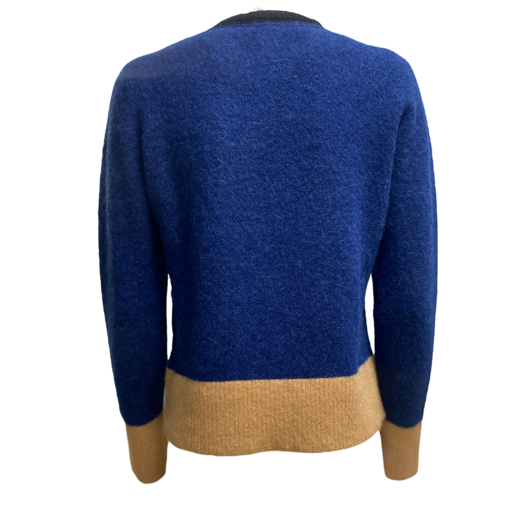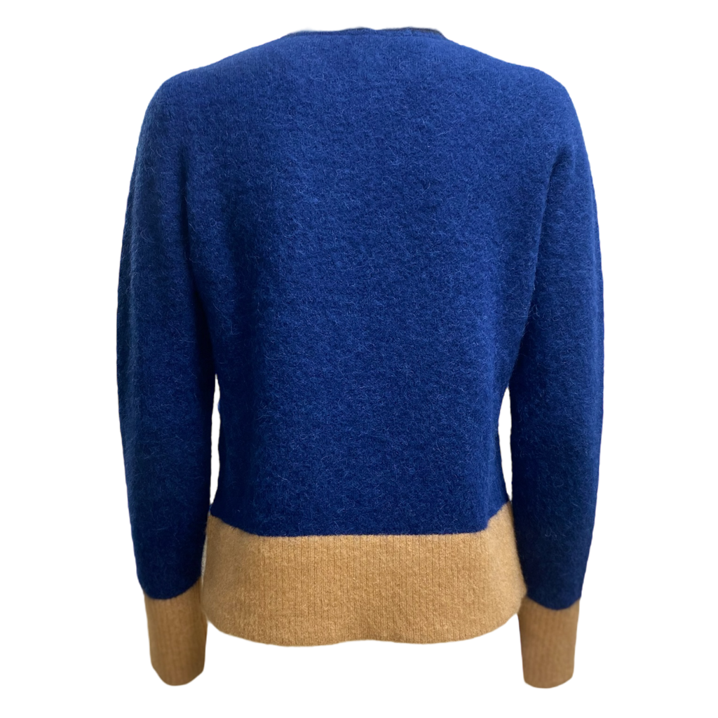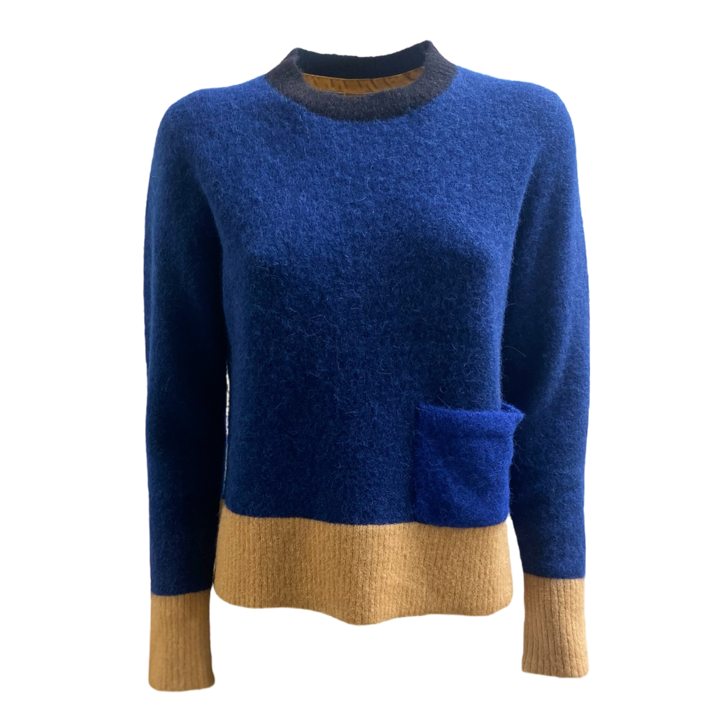 Maglia blu in morbidissima alpaca, con bordi a contrasto e tasca.