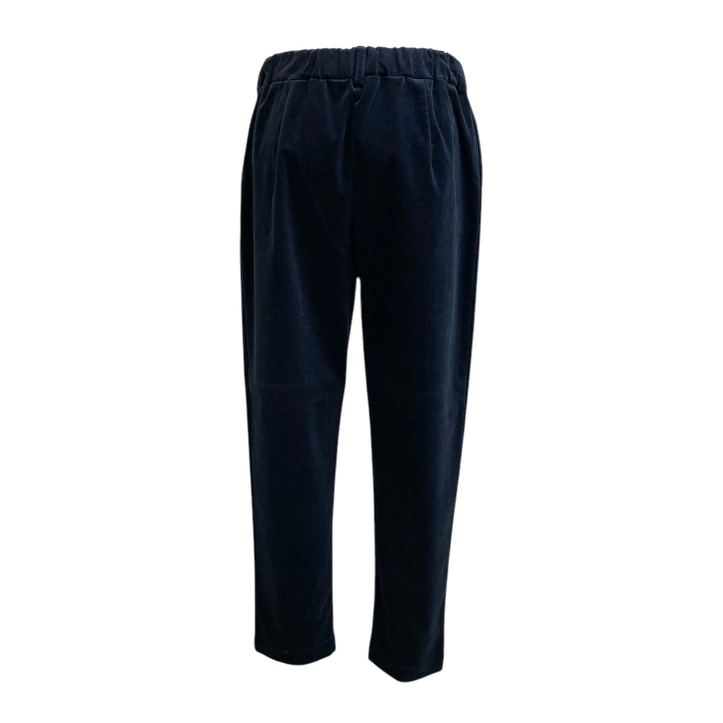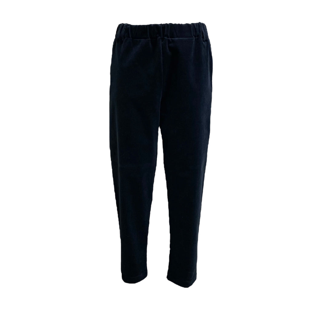 Pantalone in velluto blu, con elastico in vita e tasche.