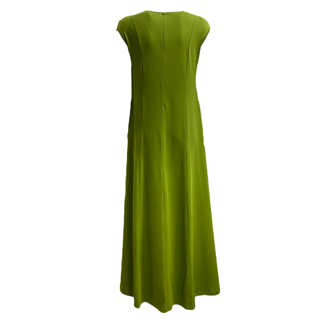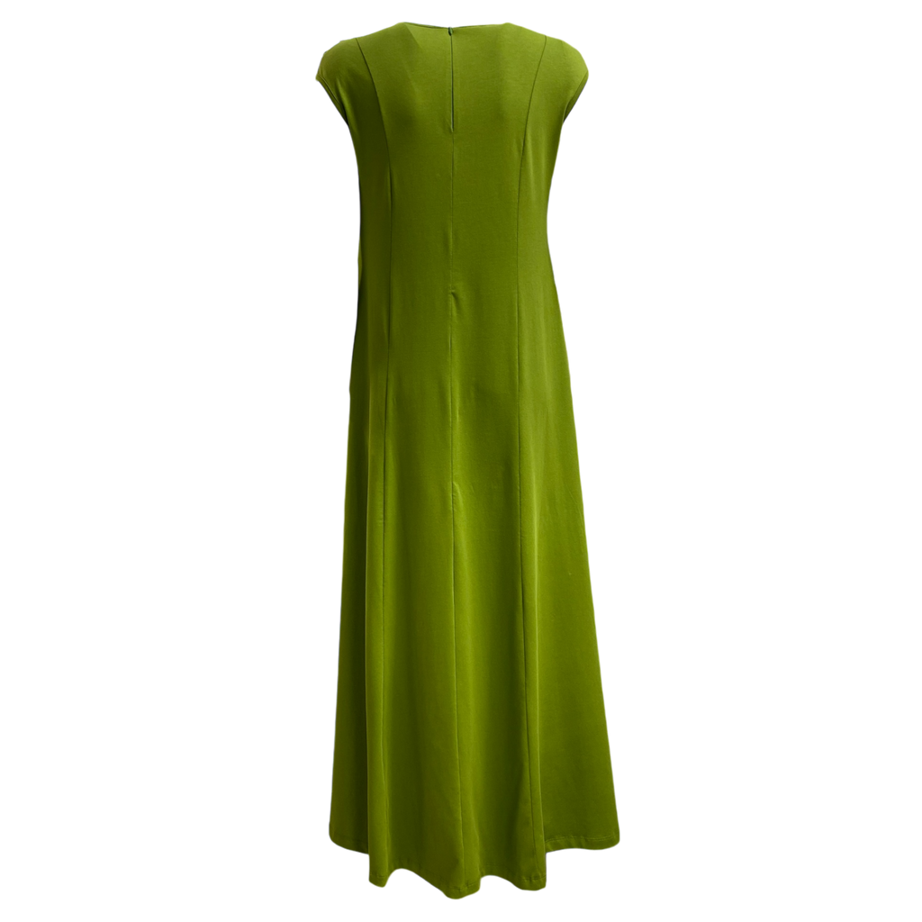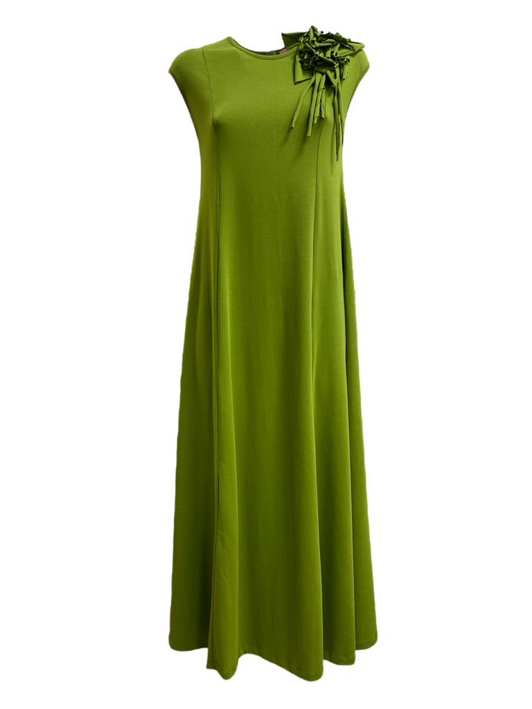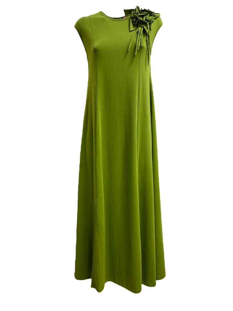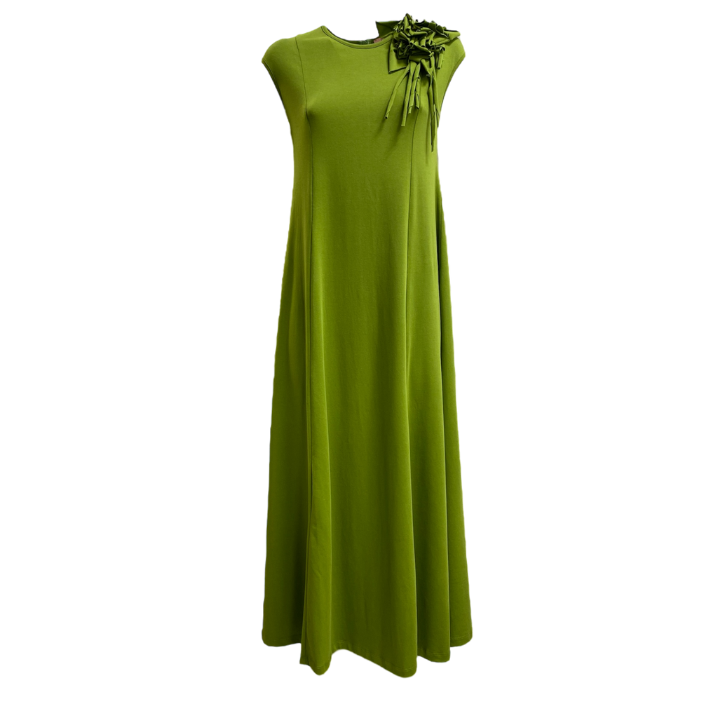 Abito svasato lungo smanicato in jersey di cotone verde olio con spilla fiore.