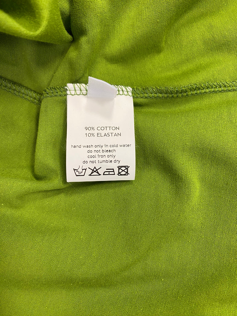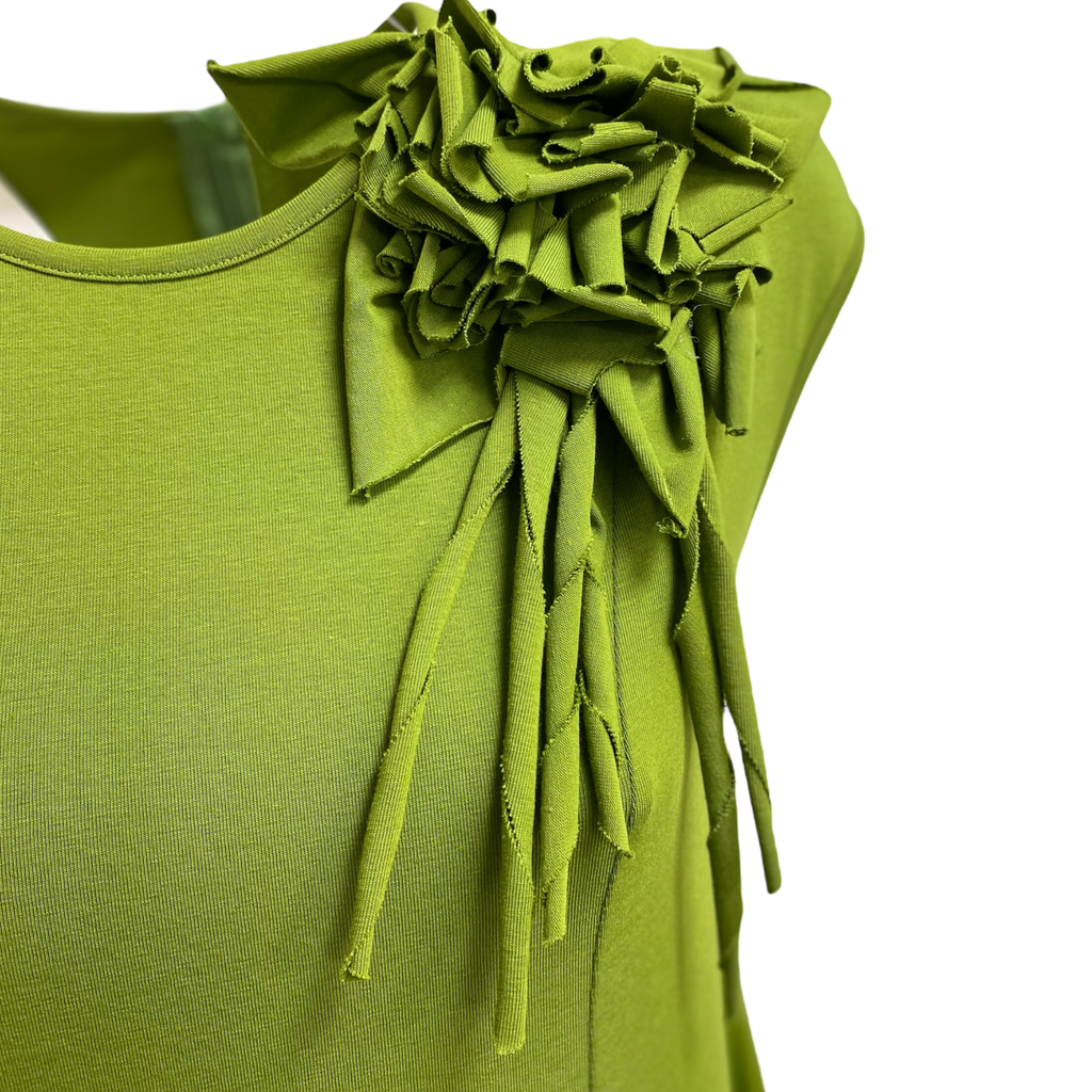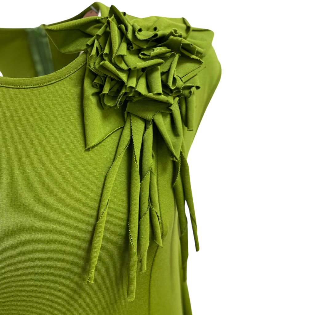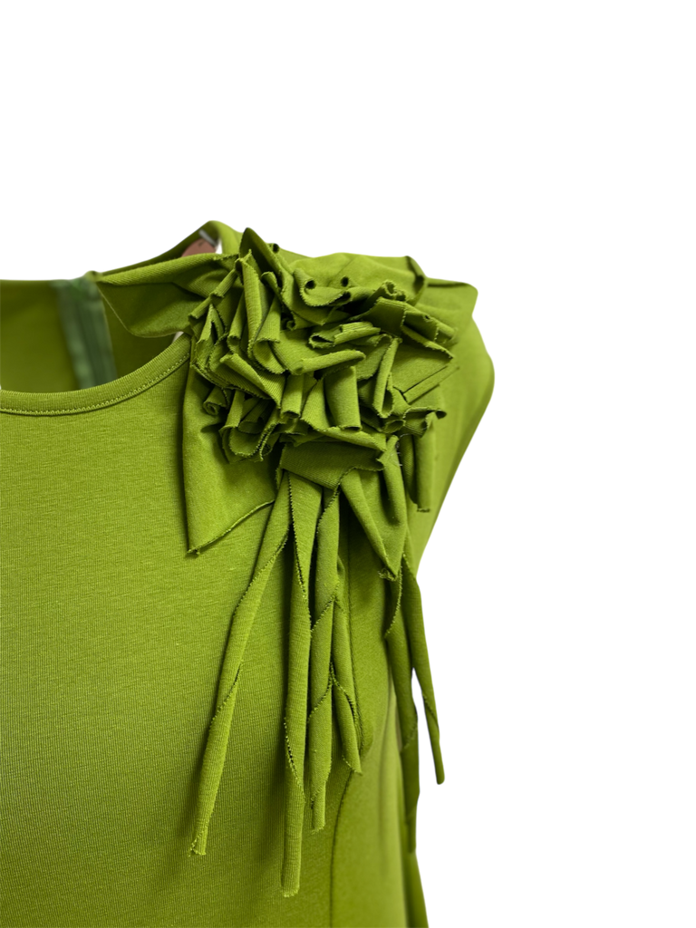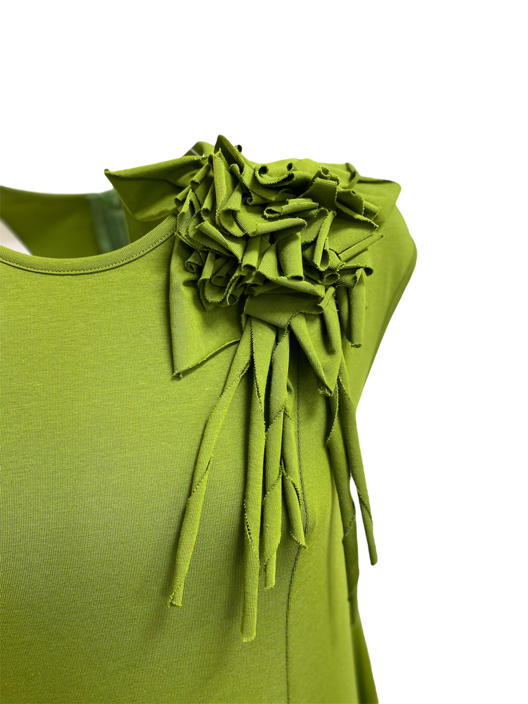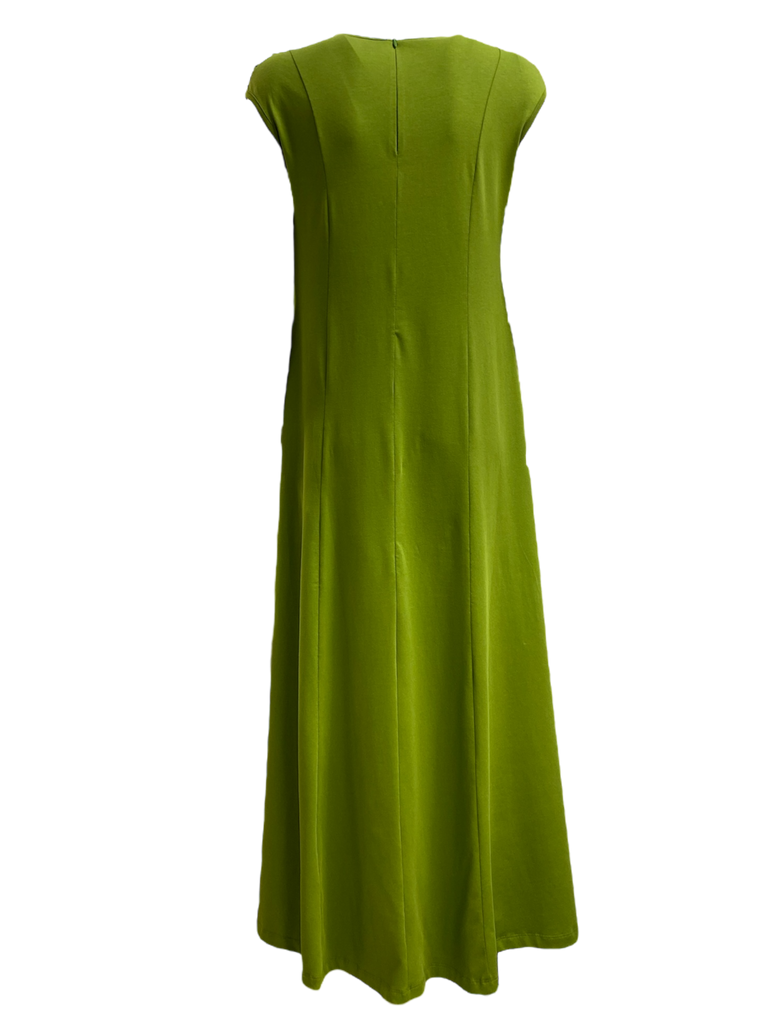 Abito svasato lungo smanicato in jersey di cotone verde olio con spilla fiore.