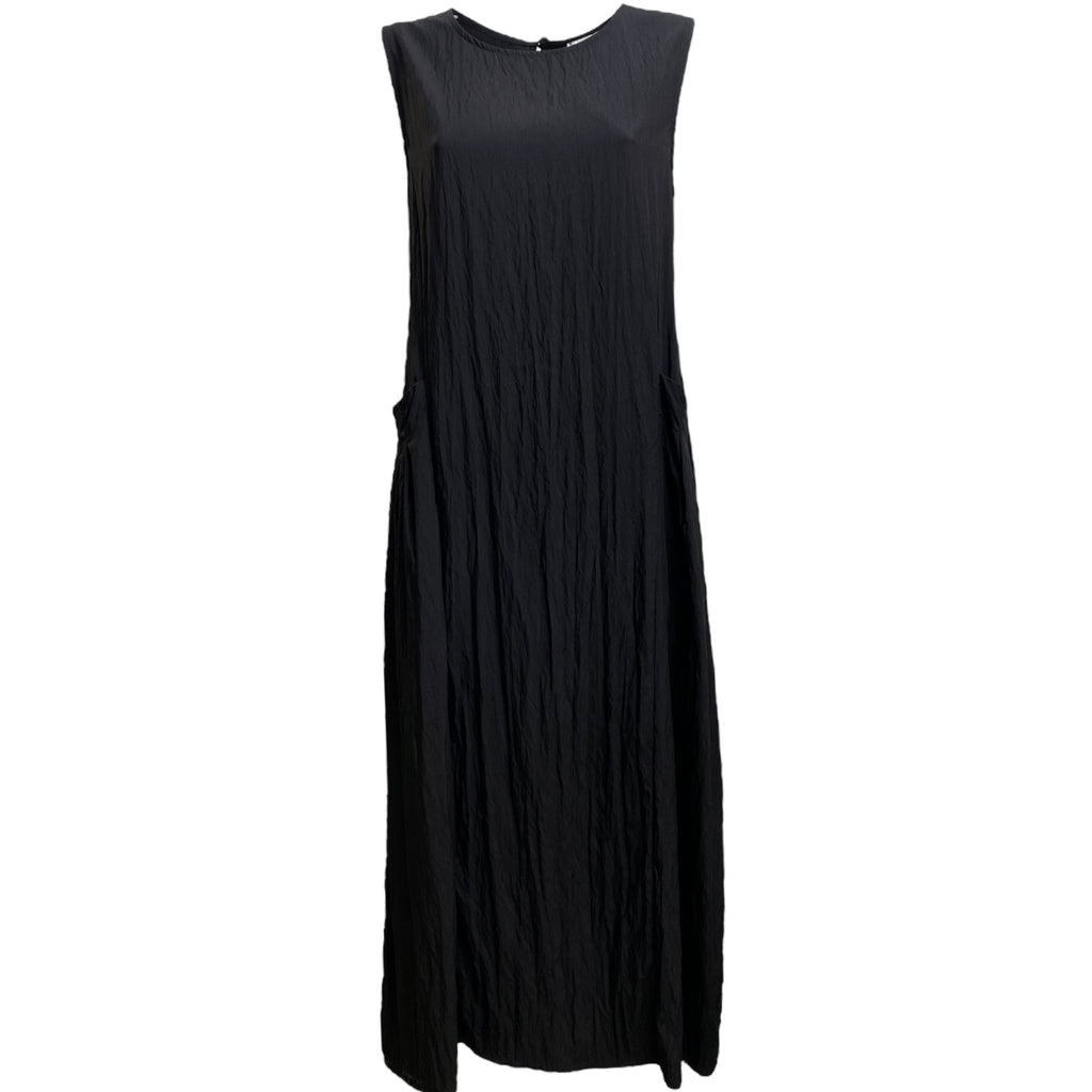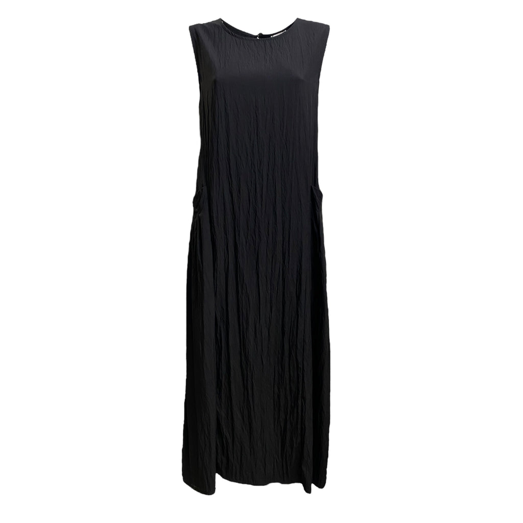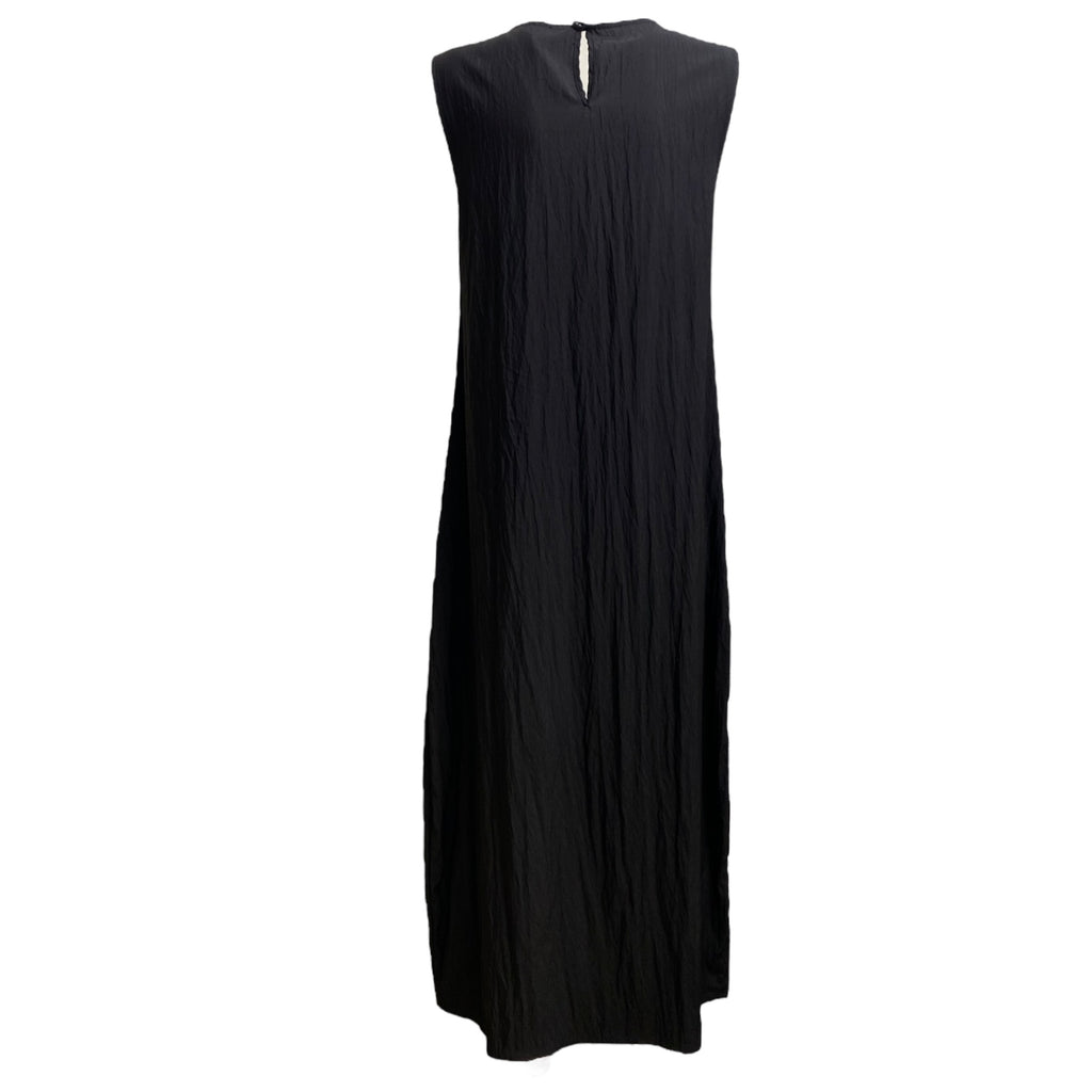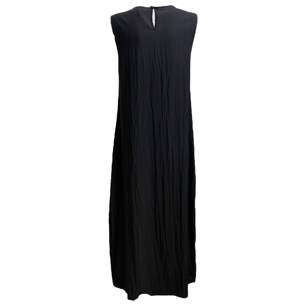 Abito nero lungo in tessuto stropicciato di viscosa con tasche.
