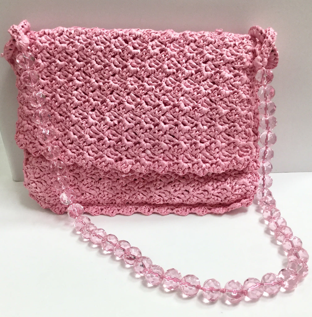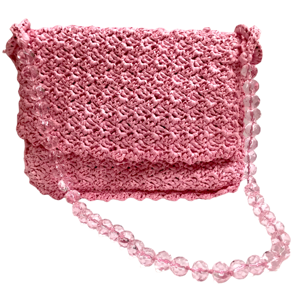 Borsetta in rafia rosa con manico in sfere di cristallo.